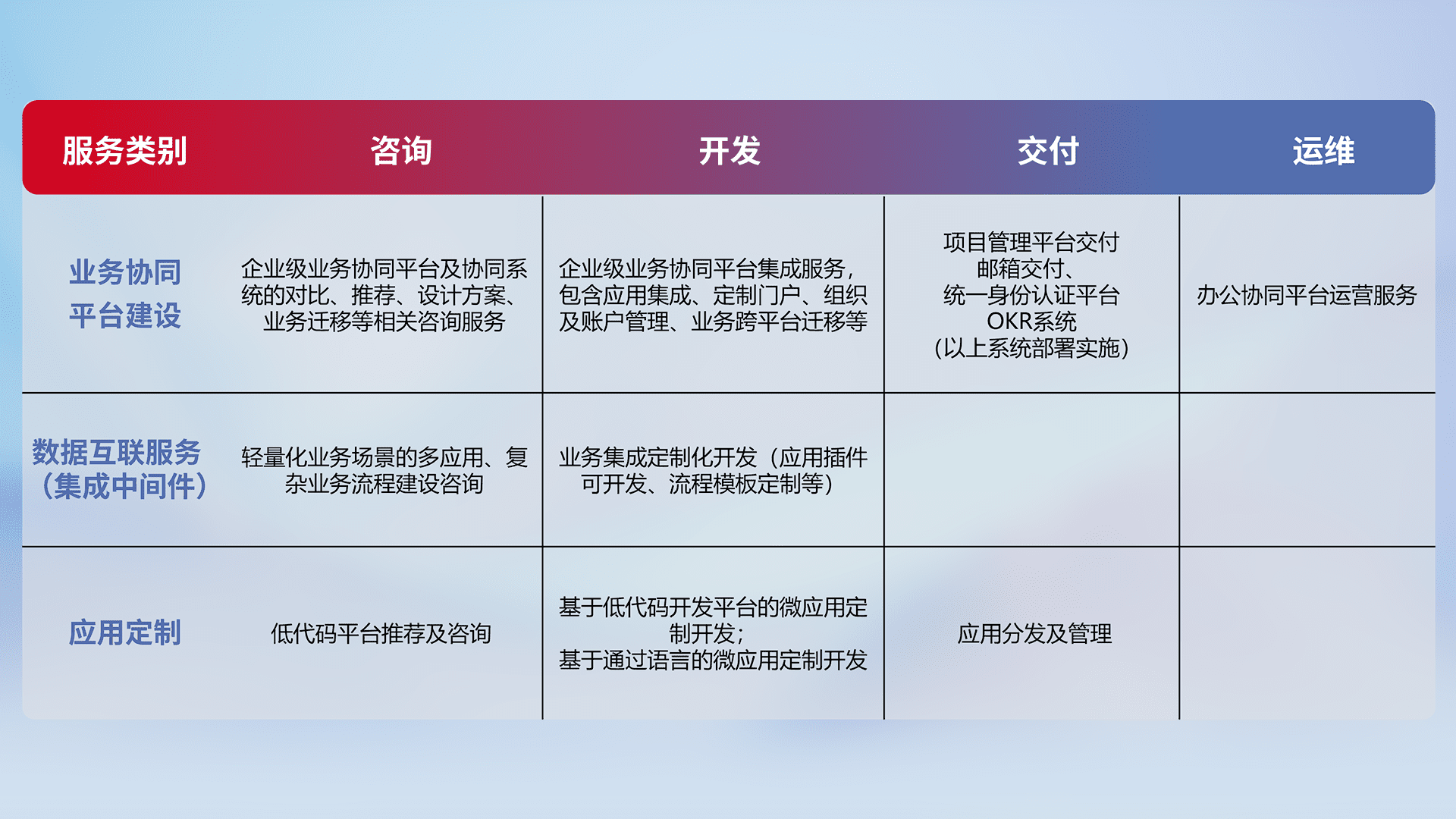 针对钉钉、、企微、、、、IDaas等平台级产品提供产品的规划、、、、方案、、、交付、、、定制化开发等服务,,,实现如统一协同办公、、智能客户服务、、、混合会议管理、、、智能数据查询、、、等业务场景,,,实现数字化转型。。